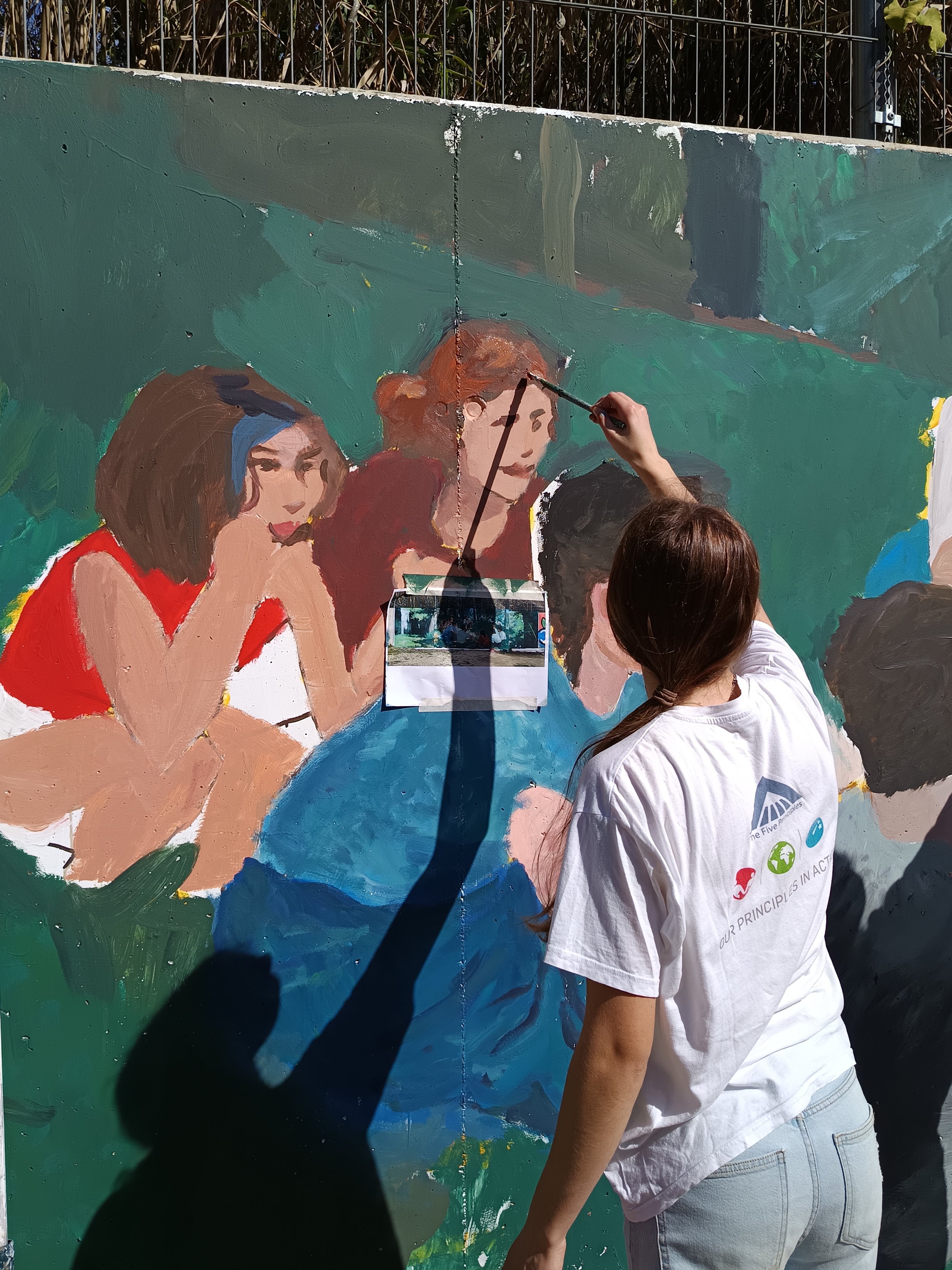 La segona part del procés ha estat la de la producció de la pintura mural al carrer. Des del fondejat base fins als acabats finals, els alumnes han treballat de manera col·lectiva amb l'artista per fer el disseny realitat.